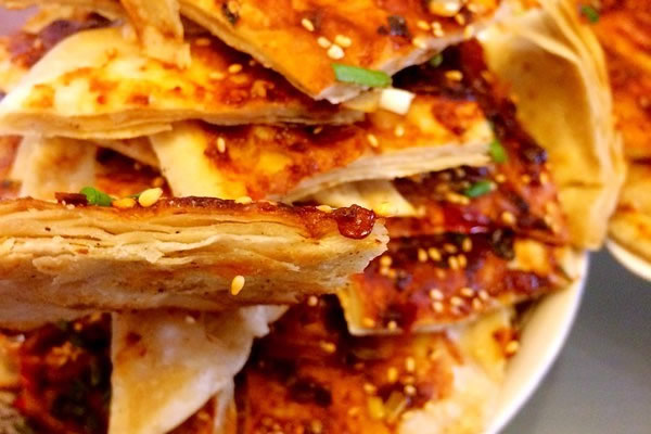11.关火,刷上酱料,撒白芝麻和葱花,出锅切块就可以开吃啦.